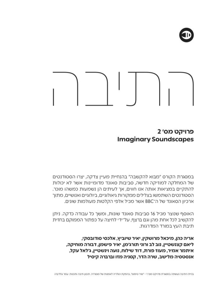 מהיום ניתן להקשיב בלחיצת כפתור, ל-16 סביבות סאונד שיצרו סטודנטים מהמחלקה למוזיקה חדשה במסגרת הקורס ״מבוא להקשבה״. סביבות הסאונד בוקעות זו אחר זו מתוך תיבת סאונד הממוקמת למרגלות המדרגות הפנימיות של בית הספר מוסררה. זהו הפרויקט השני בסדרת "התיבה", בהפקת גלריות מוסררה.