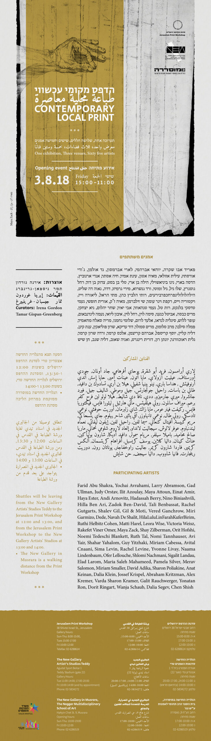 שלושה מרכזי אמנות בירושלים: סדנת ההדפס ירושלים, הגלריה החדשה סדנאות האמנים טדי והגלריה ע"ש דרפלר במוסררה – משתפים פעולה בתערוכה ראשונה בהיקפה המציגה תמונת מצב של ההדפס העכשווי בארץ.