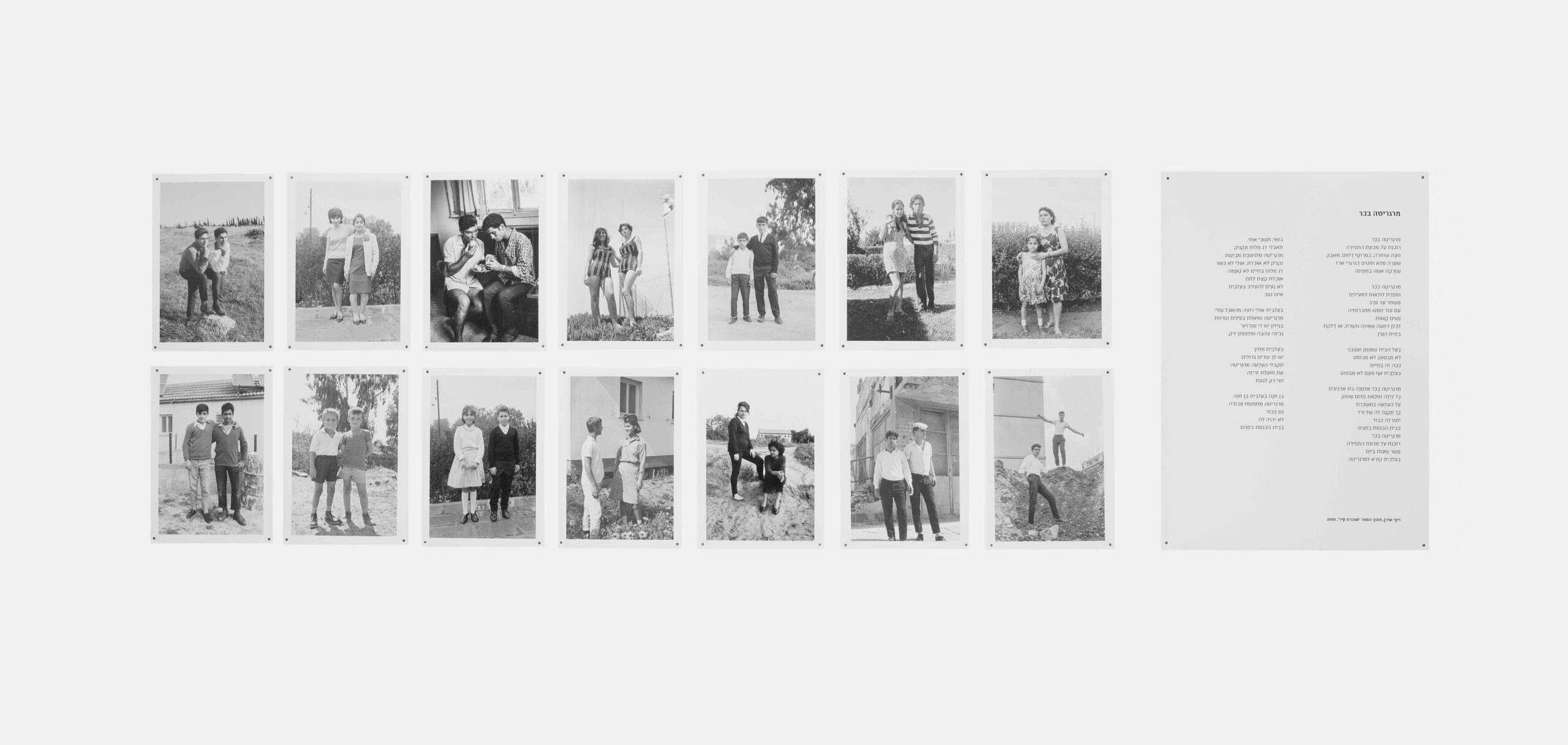 התערוכה בגלריה לאמנות של מוסררה מספקת הצצה לארכיון תצלומים דיגיטליים בשחור־לבן, המקוטלגים לפי נושאים הרווחים בעבודתו של ירושלמי: תצלומי דיוקנאות, זוגות, כלי תחבורה, חבורות והווי בשכונת מורשה.