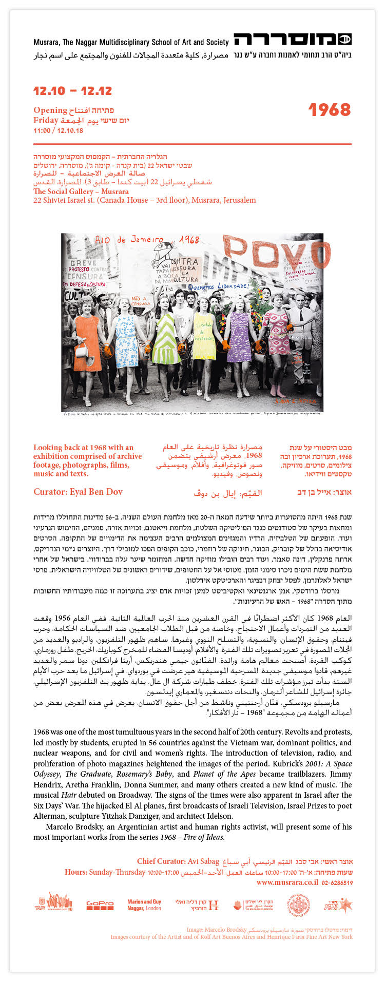 בתערוכה יציג מרסלו ברודסקי, אמן ארגנטינאי ואקטיביסט למען זכויות אדם, כמה מעבודותיו החשובות מתוך הסדרה "1968- האש של הרעיונות". הסדרה הוצגה לאחרונה בפסטיבל הצילום המפורסם בארל שבצרפת.